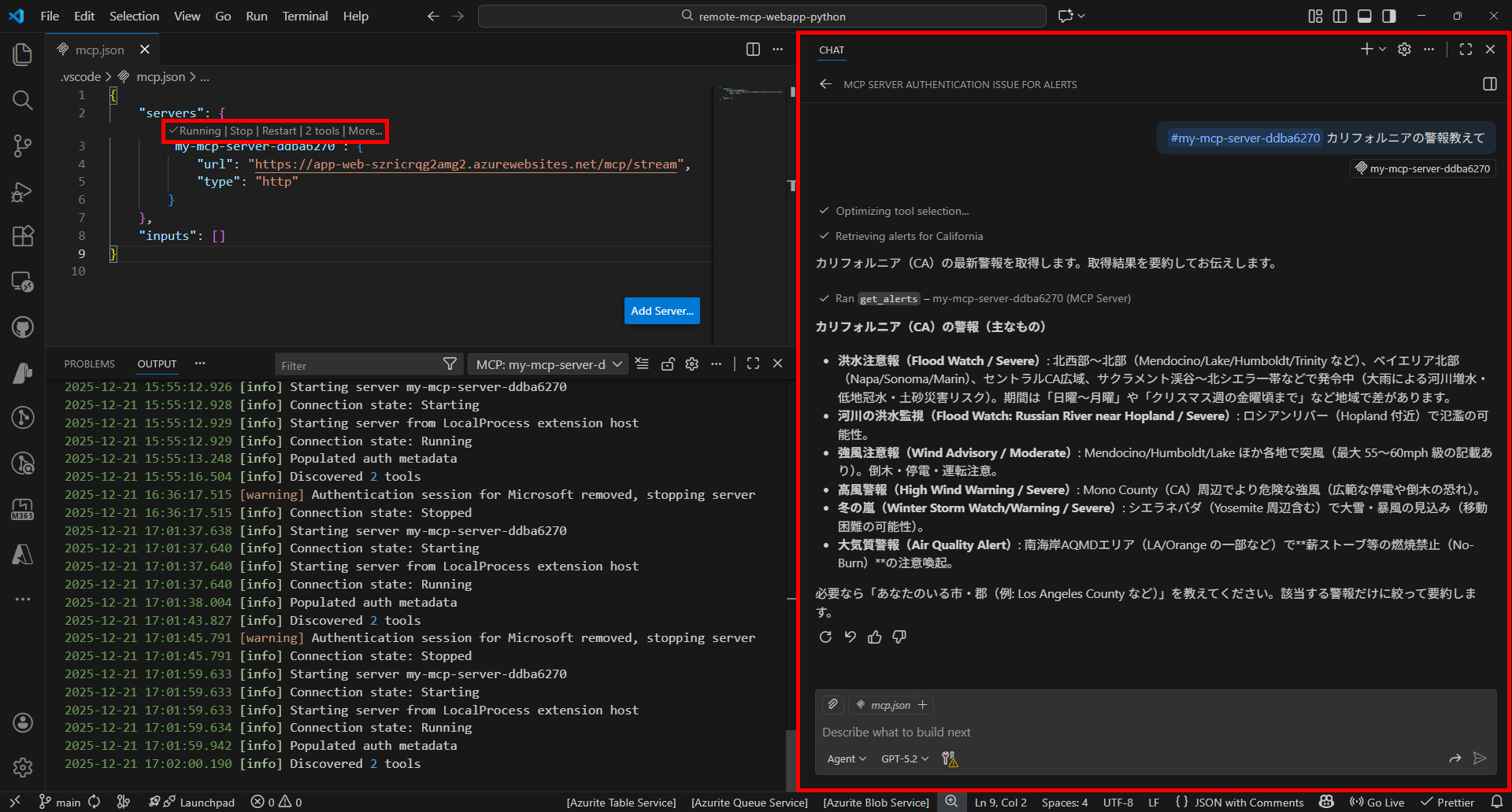 • 最後にVS Codeから接続して、ツール呼び出しまで動作確認できた