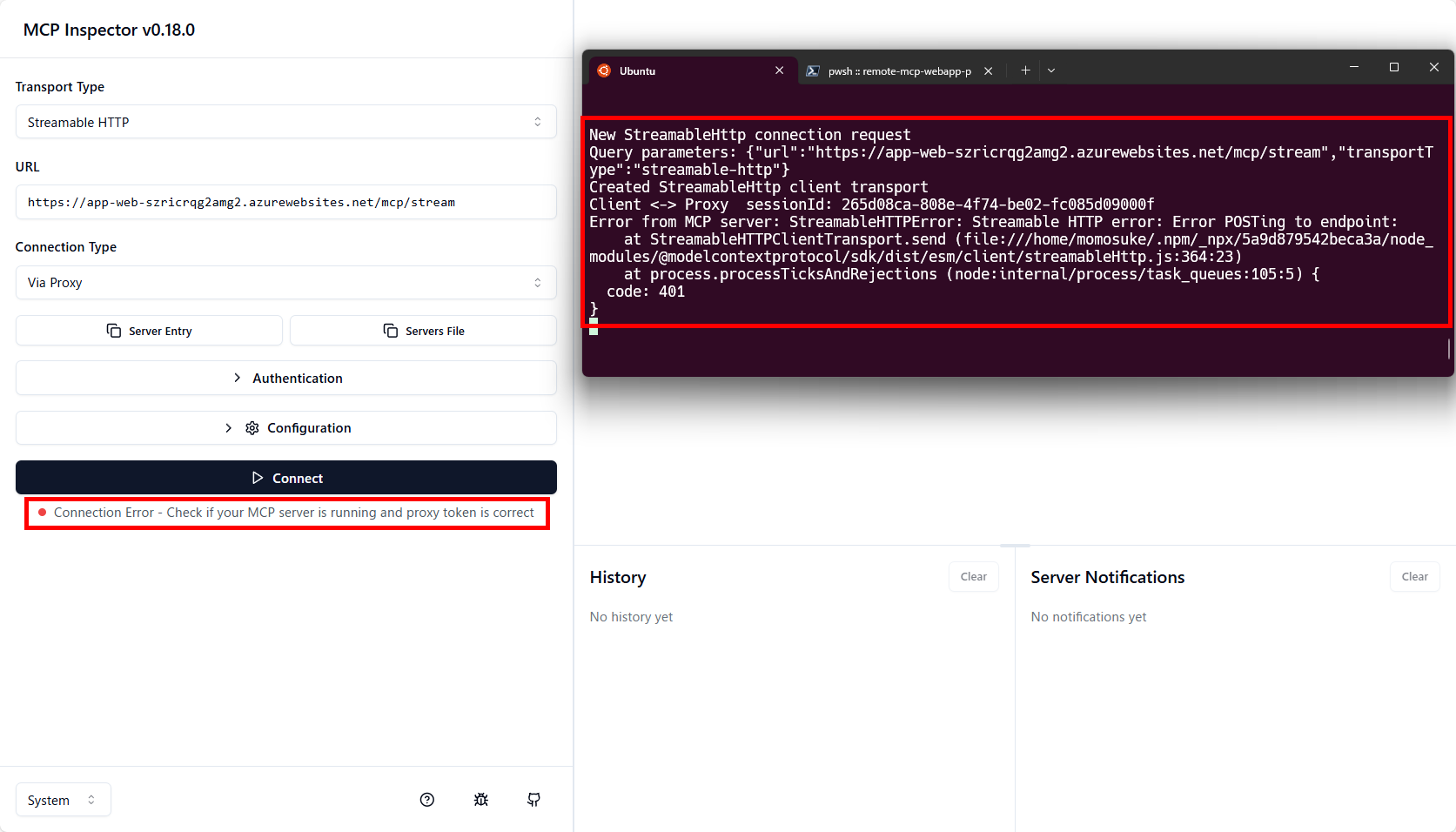 ついでにMCP Inspectorから接続できないことも確認しておきましょう。MCP Inspectorから接続を試みると、401エラーが返ってきます。