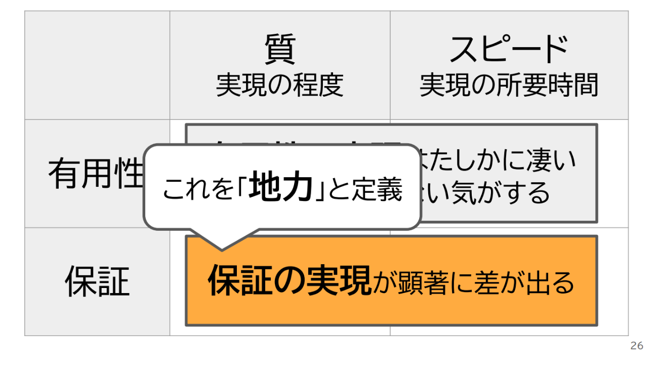 真に求められるユーザー価値を実現するために、エンジニアに求められる「地力」とは具体的に何を指すのか。馬場氏はこの問いに対し、先ほど示した「有用性」と「保証」を手がかりに、その輪郭を明らかにしていく。