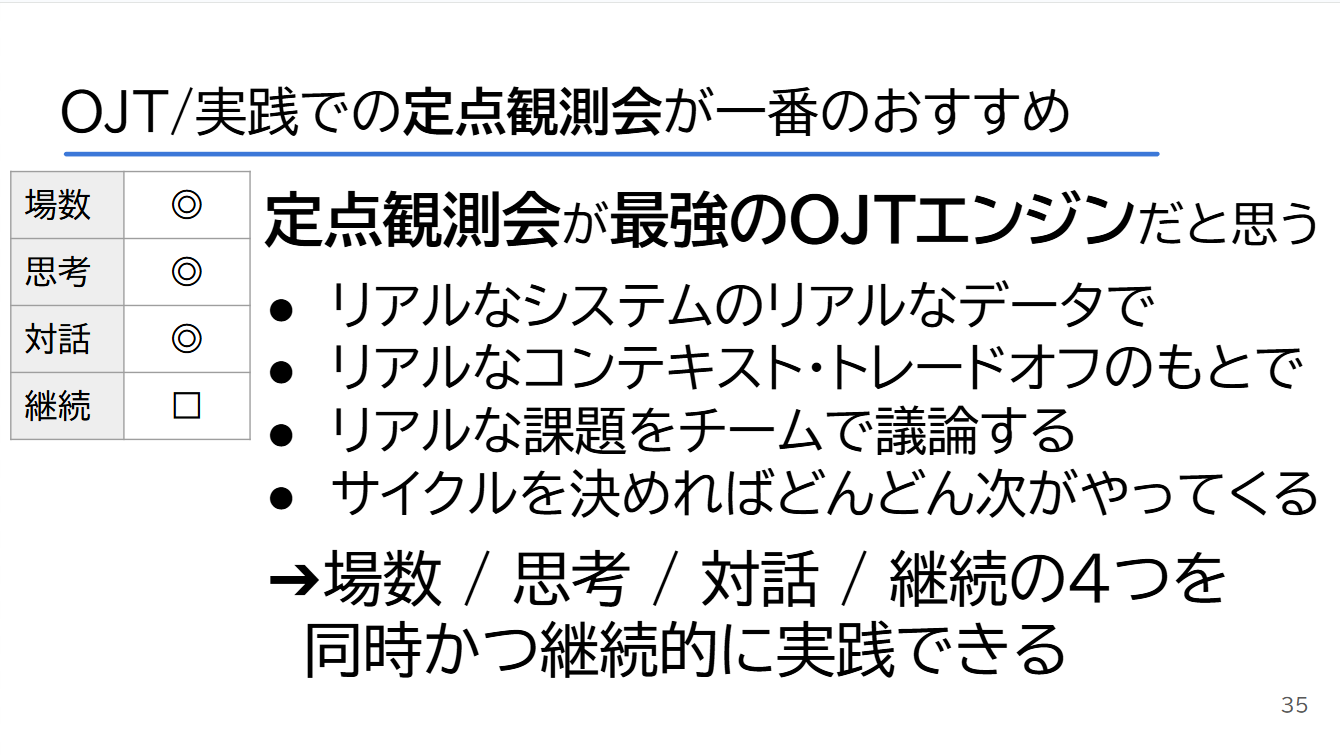 実践のアプローチは大きく3つに分かれる。ひとりで取り組む独習、読書会やトレーニングといったOFF-JT、そしてOJTや実務そのものだ。なかでも馬場氏が「最強」と断言するのが、OJTにあたる定点観測会である。定点観測会とは、運用中の実システムを対象に、実データを継続的に観測し、チームで議論する場を定期的に設ける取り組みだ。