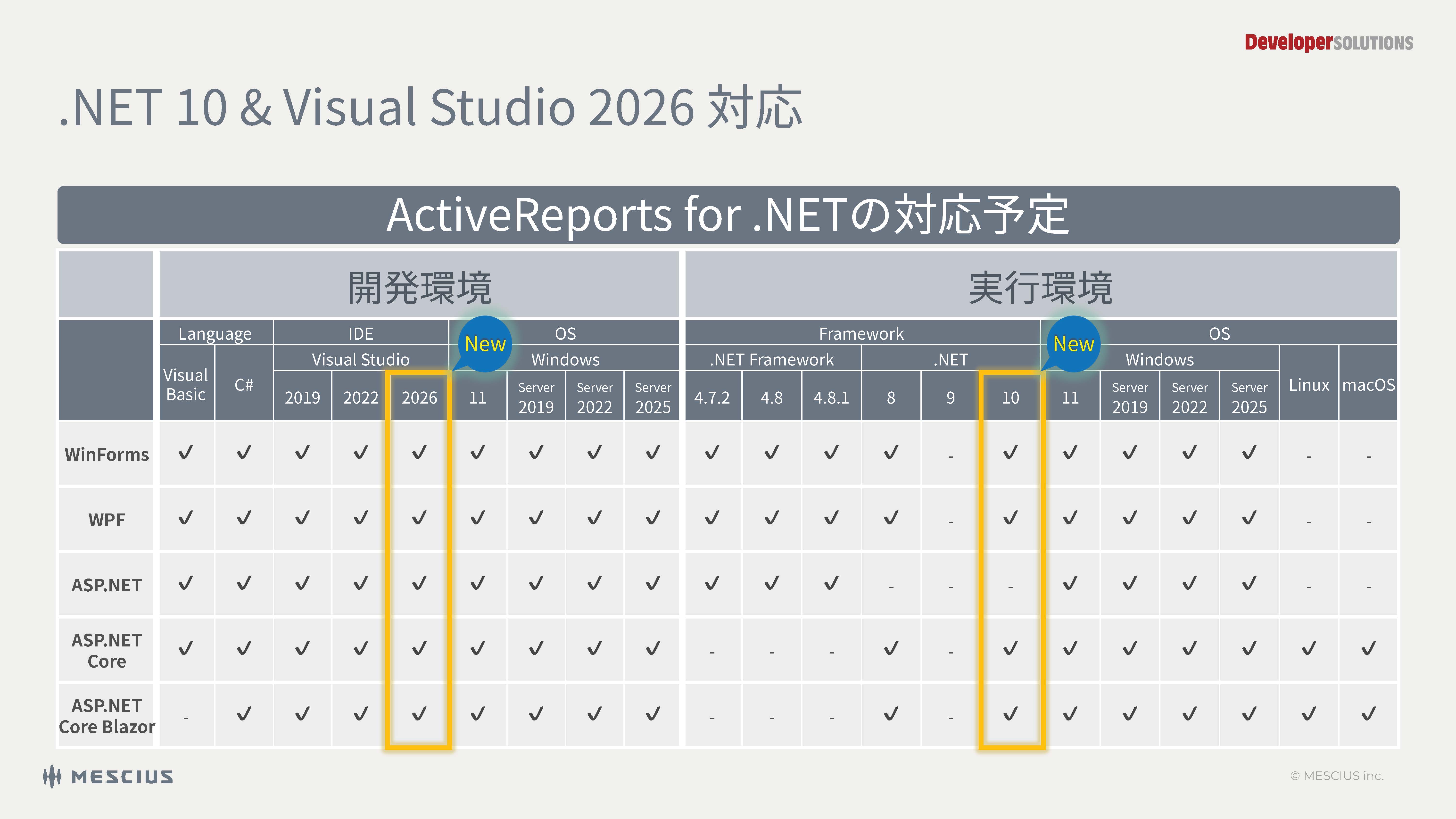 ActiveReportsの次期リリースでは、Windows FormsやWPF、ASP.NET、ASP.NET Core、ASP.NET Core Blazorといった技術を用いた開発を、.NET 10とVisual Studio 2026の環境においてもトータルに支援する。