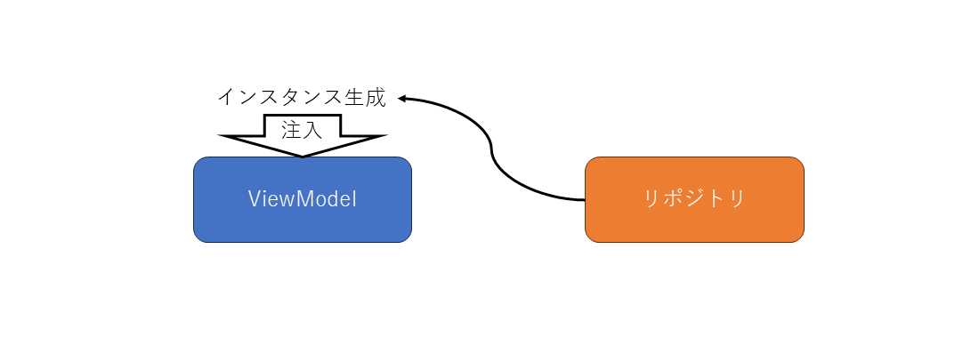 つまり、依存先クラスインスタンスが、後から注入=Injectionされるのです。前項の例ならば、ViewModelのインスタンスが生成される際に、リポジトリインスタンスを受け取るようにします(図3)。