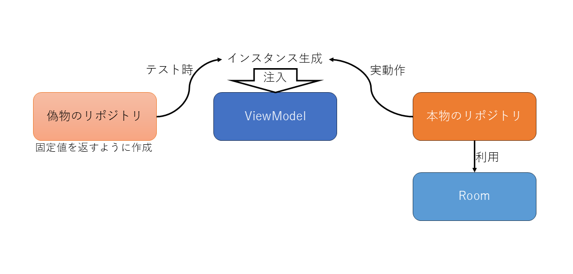 例えば、ViewModelに対して、実動作する場合は、実動作用の(本物の)リポジトリクラスインスタンスを渡します。一方で、単体テストの場合は、本物のリポジトリクラスに似せて作った偽物のリポジトリクラスを渡します。本物のリポジトリクラスがRoomを利用してデータベースのデータを利用するように作られているとしたら、偽物の方は、実際にRoomを利用するのではなく、常に同じ結果を返す、つまりデータをハードコーディングしてメソッドを作成します。