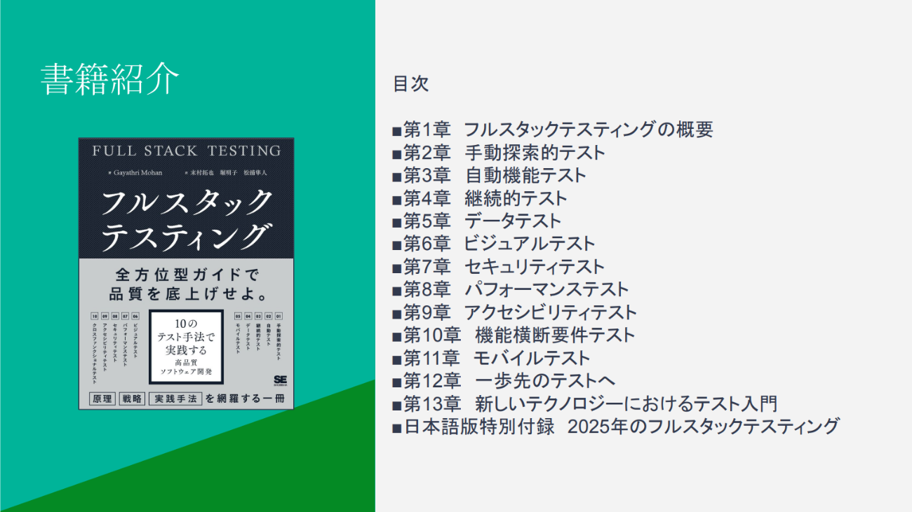 こうした多様な専門性をもつ有識者たちによって世に送り出されたのが、書籍『フルスタックテスティング』である。400ページを超える同書は、フルスタックテスティングの概念から始まり、手動探索的テスト、自動テスト、データ、セキュリティ、モバイル、パフォーマンス、アクセシビリティなど、10を超える領域が網羅されている。特定の手法や立場に偏ることなく、ソフトウェア品質を全方位から捉えようとする構成こそが、本書の最大の特徴である。