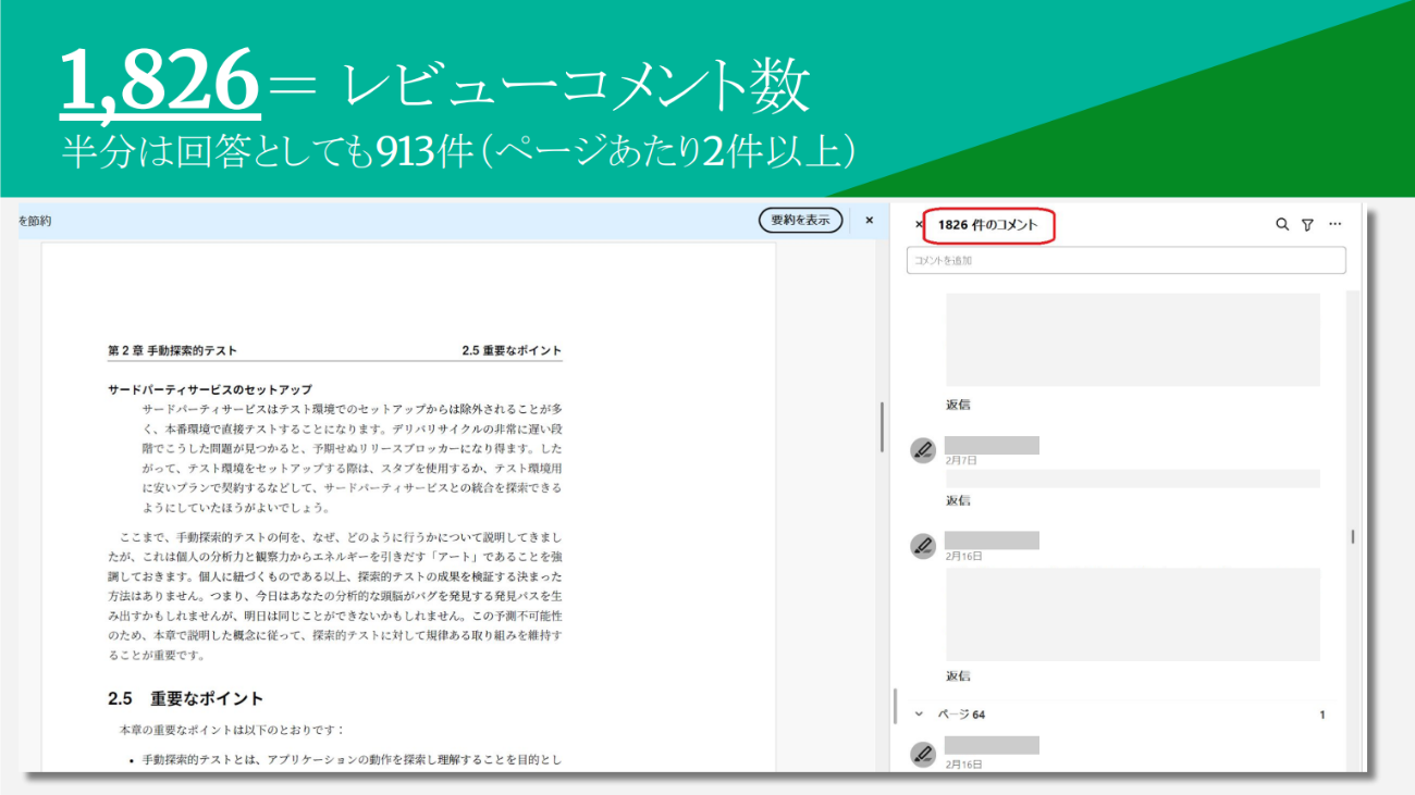 セッション終盤では、本書の完成度を大きく押し上げた「レビュープロセス」に話題が移った。ここで示されたのは「1826」という数字。これは、わずか1か月ほどのレビュー期間中に寄せられたコメントの総数だという。