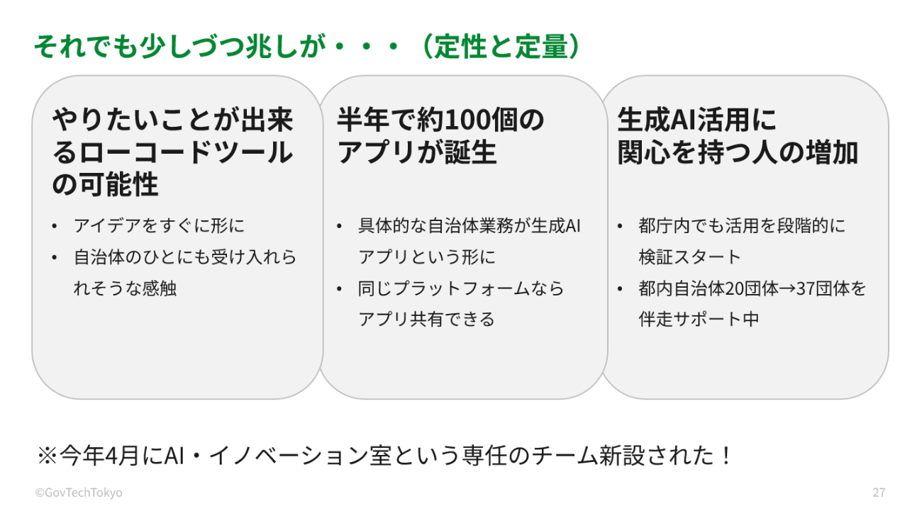 関心の広がりも顕著だ。都庁内では段階的な検証が始まり、GovTech東京が生成AIプラットフォームの活用支援を行う都内自治体の数も20団体から37団体へと拡大した。組織面でも変化があり、横断プロジェクトにとどまらず、AI・イノベーション室という専任組織が新設された。
