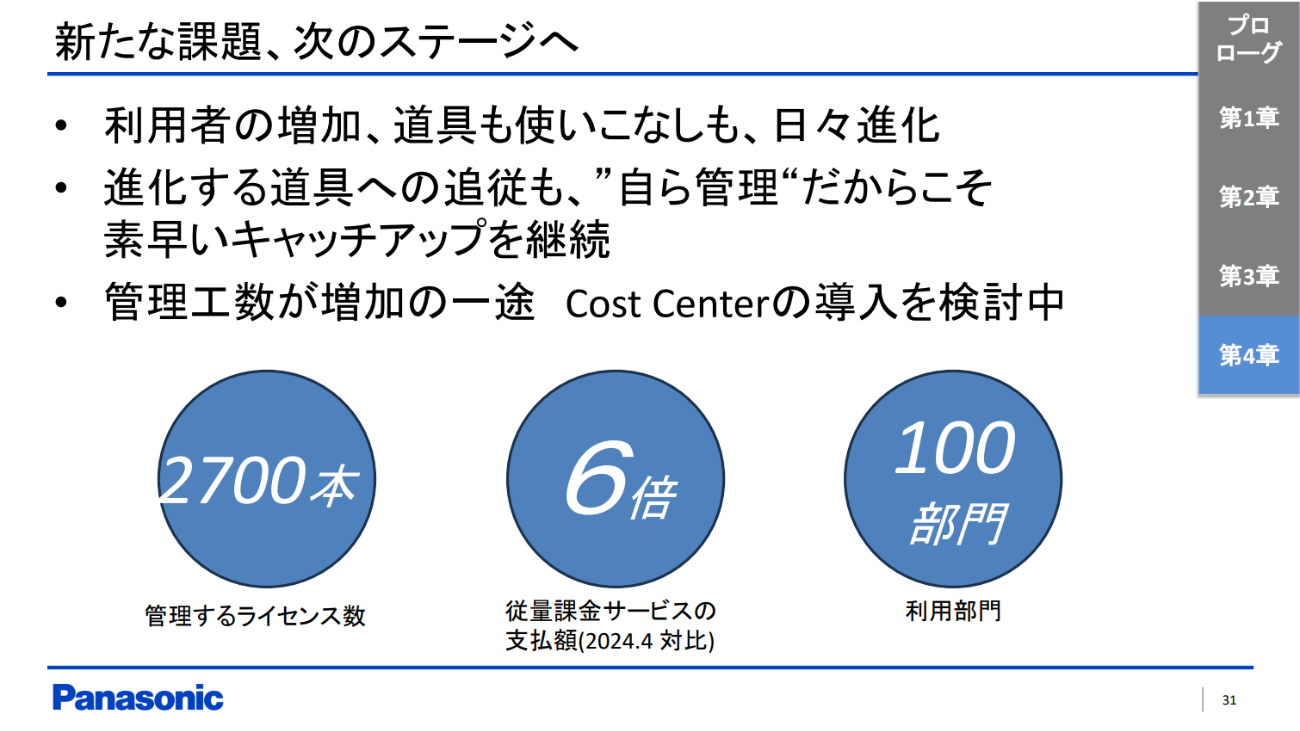 とはいえ、部門ごとの予算管理や費用配賦といった課題はなお残る。今後はコストセンター機能の活用などを通じ、管理負荷を抑えつつ、利用の自由度をどう維持していくかを模索していく段階だ。