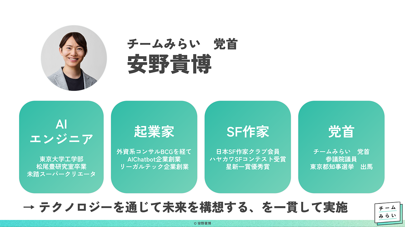 一見バラバラに見えるこれら4つの職業だが、安野氏はこれらを「同じ筋肉を使い続けている」と表現する。「テクノロジーを通じて未来がどうなるのかを妄想し、アウトプットする」という行為において、アウトプットされたものがコードであるか、ビジネスであるか、小説であるか、あるいは政策であるかというパッケージの違いに過ぎないのだ。技術が社会を高速に変える現代において、技術の使い道を考え、実装することは、エンジニアリングの延長線上にある営みなのである。