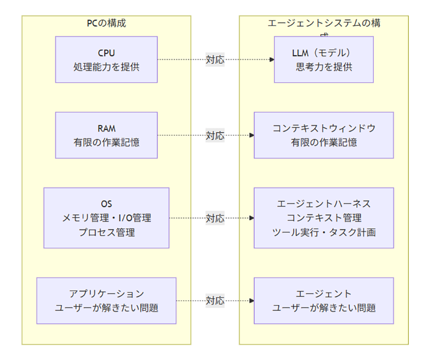 Google DeepMindのStaff Engineerであり、元Hugging FaceのTechnical Leadを務めたPhilipp Schmid氏は、エージェントハーネスを「AIモデルを包み込み、長時間実行されるタスクを管理するためのインフラストラクチャ」と定義しています[2]。つまり、エージェントハーネスはエージェントそのものではなく、エージェントが安定動作するための「土台」を指します。この関係をPCの構成に例えると、図1のような対応関係になります。