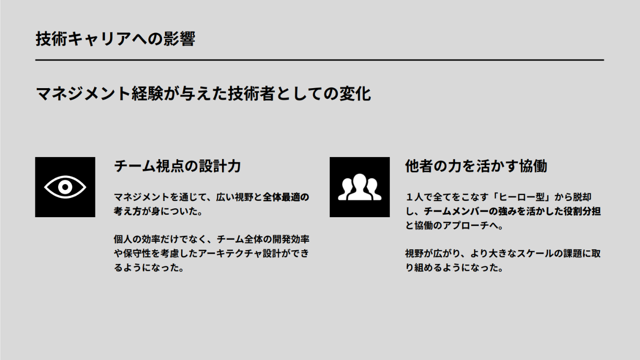 この経験は、自身の技術観にも影響を与えた。個人のタスクだけでなく、コードがプロダクト全体に与える影響を意識するようになったという。全体最適の視点が身についたことで、1人が奮闘する「ヒーロー型」の働き方から脱却し、個々の強みを掛け合わせる「協働」へと意識が変化した。純粋なコーディング力だけでは得られない「開発を前に進める力」を身につけたと、赤坂氏は振り返る。