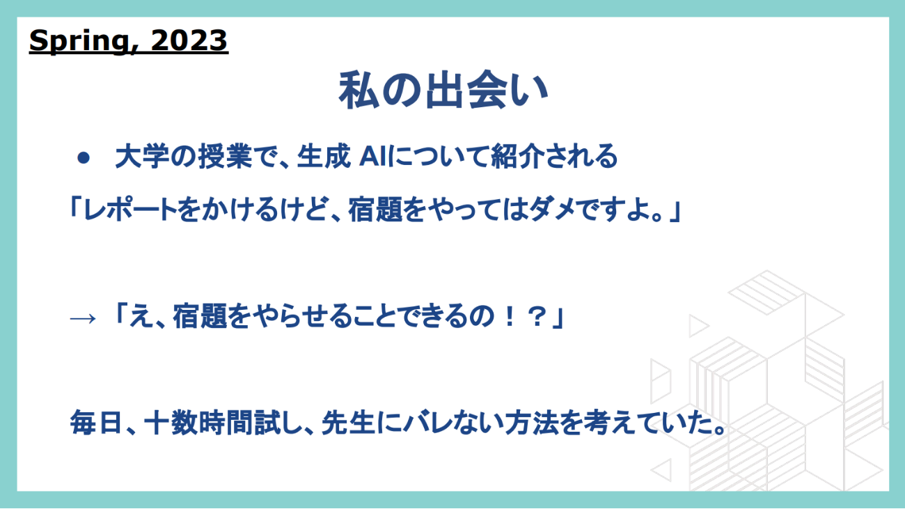 しかし、授業では「ChatGPTはレポートも書けるが、宿題に使ってはならない」と注意を受けた。そこで大塚氏の心に浮かんだのは、「ChatGPTを使えば、宿題をサボれるのではないか」という発想だった。大塚氏の関心は「宿題をどうこなすか」ではなく、「いかにしてバレずに宿題をサボるか」へと移っていった。