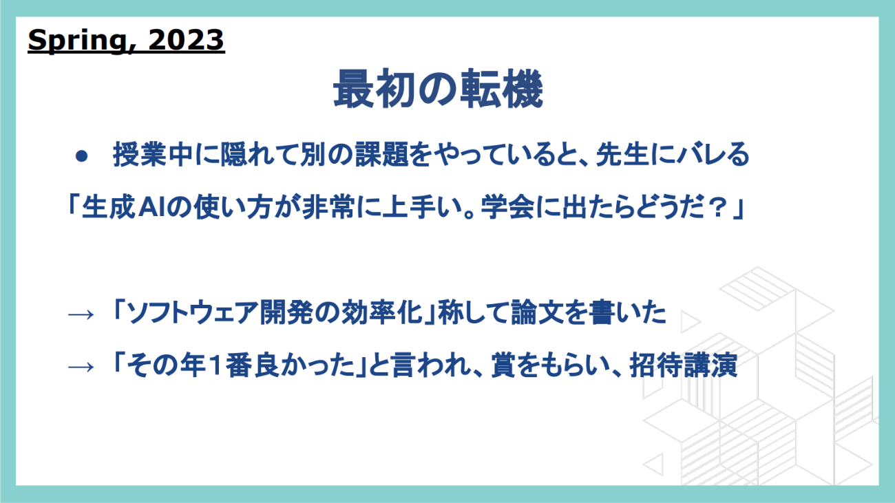 だが、教員の反応は予想外であった。「生成AIの使い方が非常にうまい」「こんな活用例は見たことがない」と評価され、さらには「学会で発表してみないか」と提案された。