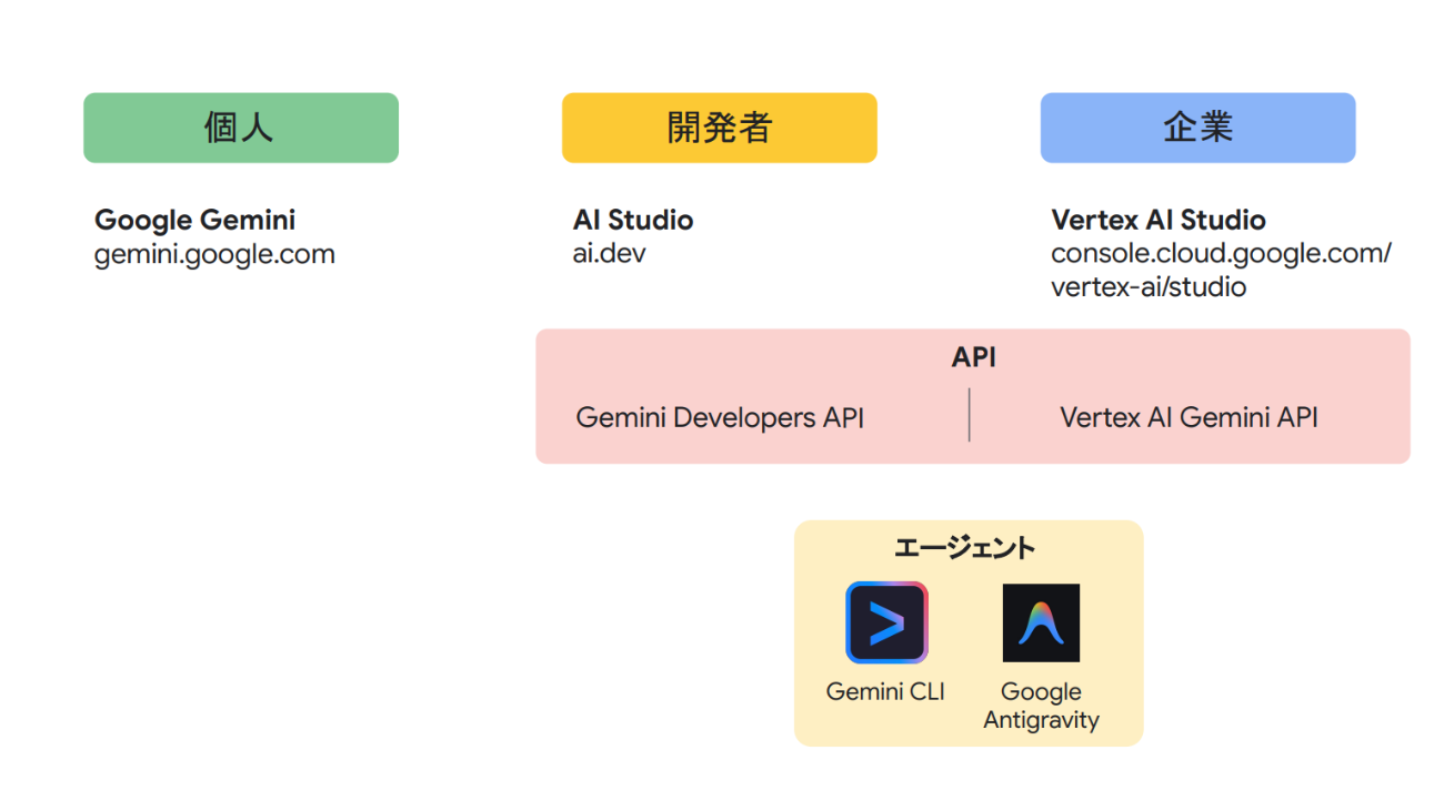 Googleのコーディング支援ツールは、利用者の属性によって層が分かれている。個人向けの「Google Gemini」アプリ、開発者向けAPIプラットフォームの「Google AI Studio(ai.dev)」、企業向けのセキュアな環境を提供する「Vertex AI Studio」がある。そして、エージェントとして位置づけられるのが、「Gemini CLI」と「Google Antigravity」の2つだ。