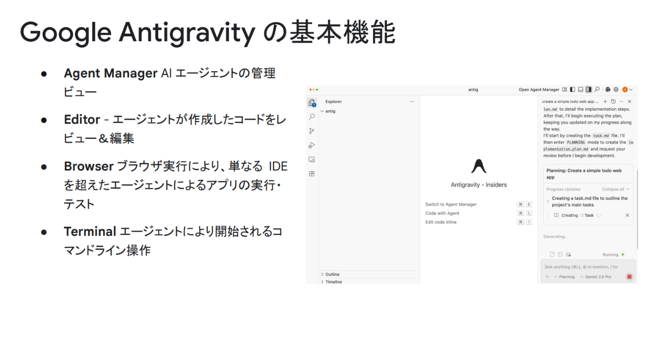 Google Antigravityは、VSCodeをベースに構築されたエージェントファーストなIDEだ。構成要素として「Agent Manager」「Editor」「Browser」「Terminal」の4つがある。