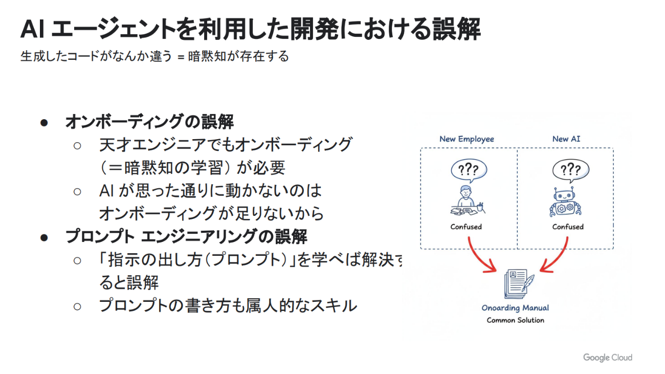 1つ目は「オンボーディングの誤解」だ。AIが期待どおりに動かないとき、多くの人はAIの精度に問題があると考えがちだ。しかし実際には、どんな優秀なエンジニアでも新しいプロジェクトに参加したときにはオンボーディング、つまりプロジェクト固有の暗黙知の習得が必要で、それはAIにとっても同じだ。