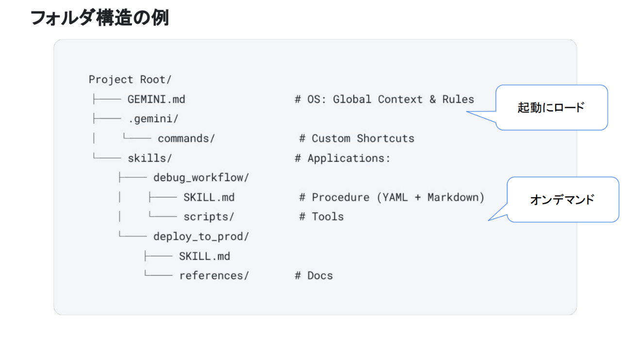 まず「GEMINI.md(System Context)」は、エージェントの人格や基本ルールを定義するファイルだ。「あなたはGoogle Cloudの専門家です」といった役割定義から、プロジェクトで使っている技術スタック、コーディングスタイル、やってはいけないことのリスト(rm -rfを使わないなど)、プロジェクトごとのルールまでを記述する。起動時に常時読み込まれるため、都度指示を繰り返す必要がない。