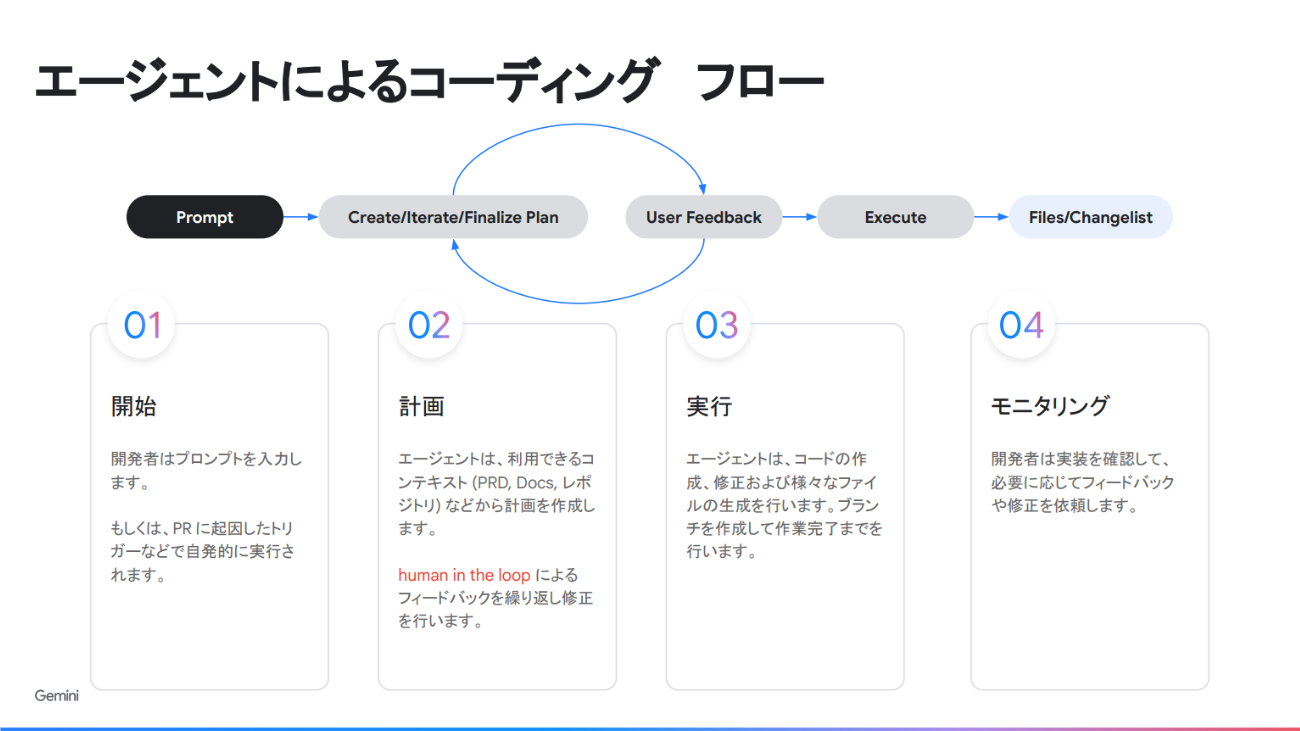 エージェントコーディングの基本フローは「開始→計画→実行→モニタリング」の4段階だ。最も人間が関与すべき重要なフェーズは「計画」にある。エージェントがPRDやドキュメント、リポジトリなどのコンテキストを参照しながら実装計画を立て、Human in the loopのフィードバックを繰り返しながら計画を精緻化する。