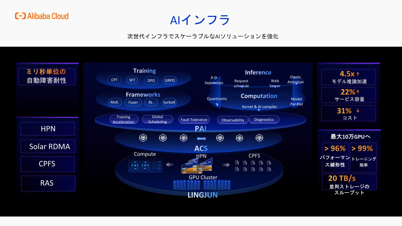 例えば、IaaSのレイヤーの「LINGJUN」。メモリやストレージの最適化を行い、LLM学習の際のGPUの効率を最適化するインフラだ。