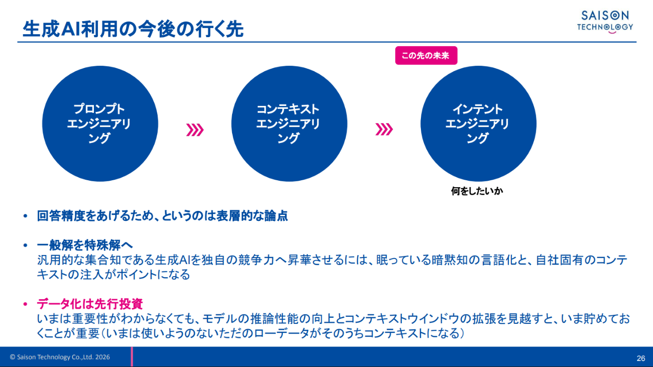 「Institutionalize」については、生成AIの現在地を俯瞰しながら、次の段階を見据えた。初期のプロンプトエンジニアリングが注目された時代から、主軸はコンテキストエンジニアリングへと移行してきた。一般解を特殊解に変え、汎用的な集合知を自社固有の競争力へ転化することが目的だ。しかし高坂氏はこれも通過点とみる。「何をしたいか、どういう制約のもとで進めるかという意図だけ伝えれば、AIが実行してくれる世界になっていきます」と述べた。