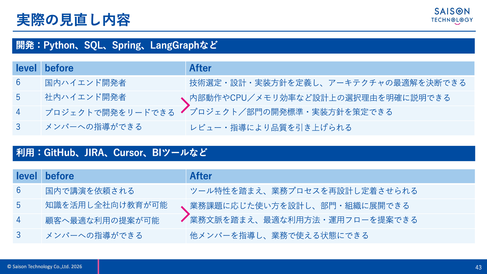 刷新後の設計では、開発技術のレベル6を「技術選定・設計・実装方針を定義し、アーキテクチャの最適解を決断できる」と明文化。レベル5は「内部動作やCPU/メモリ効率など設計上の選択理由を明確に説明できる」と定義した。ツール活用についても、使えるか否かという基準を超え「ツール特性を踏まえ、業務プロセスを再設計し定着させられる」を最高点とする。次のステップが自ずと見えるよう設計されている。