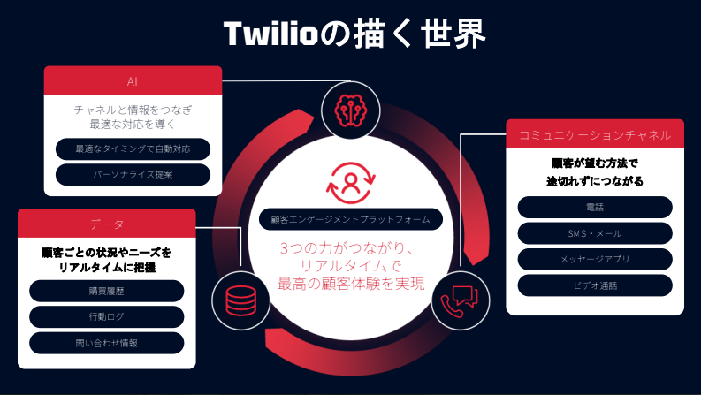 Twilioが描くAIを活用した顧客体験の世界は、データとAIとコミュニケーションチャネルの3つの柱がリアルタイムでつながり価値を高めていく「顧客エンゲージメントプラットフォーム」だ。