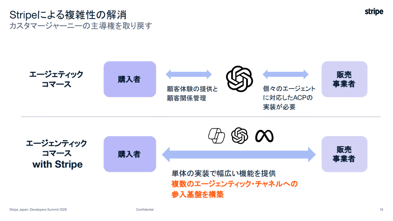 さらにストライプでは、AIエージェントの代わりに販売店の登録管理を行い、商品カタログや在庫情報の管理も担う。販売店側は、個別にAIエージェントの登録が不要で、不正対策も組み込まれた決済を利用できる。最終的には加盟店(販売店側)に顧客情報を渡し、ロイヤリティの向上にもつなげられる仕組みを目指している。