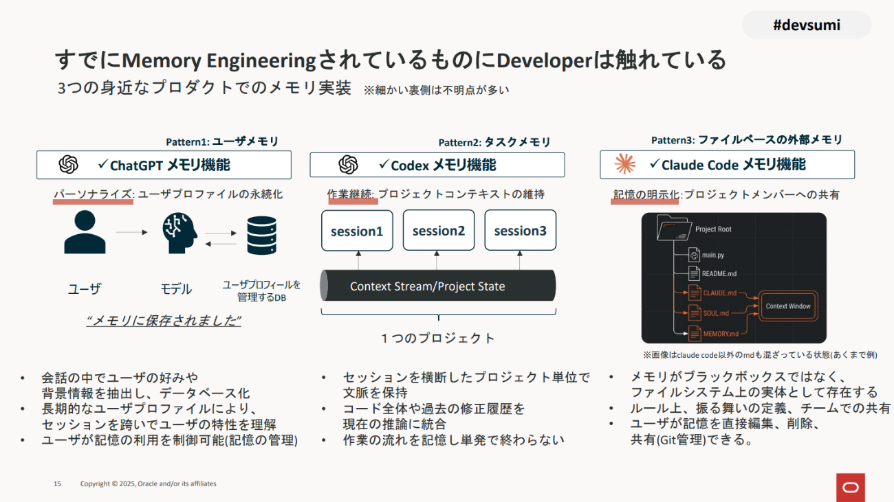 そのうえで、小川氏は「開発者であれば、メモリエンジニアリングされているものに触れているはずだ」と語り、「ChatGPT」のメモリ機能と「Codex」のメモリ機能と「Claude Code」のメモリ機能の3つの例を挙げた。