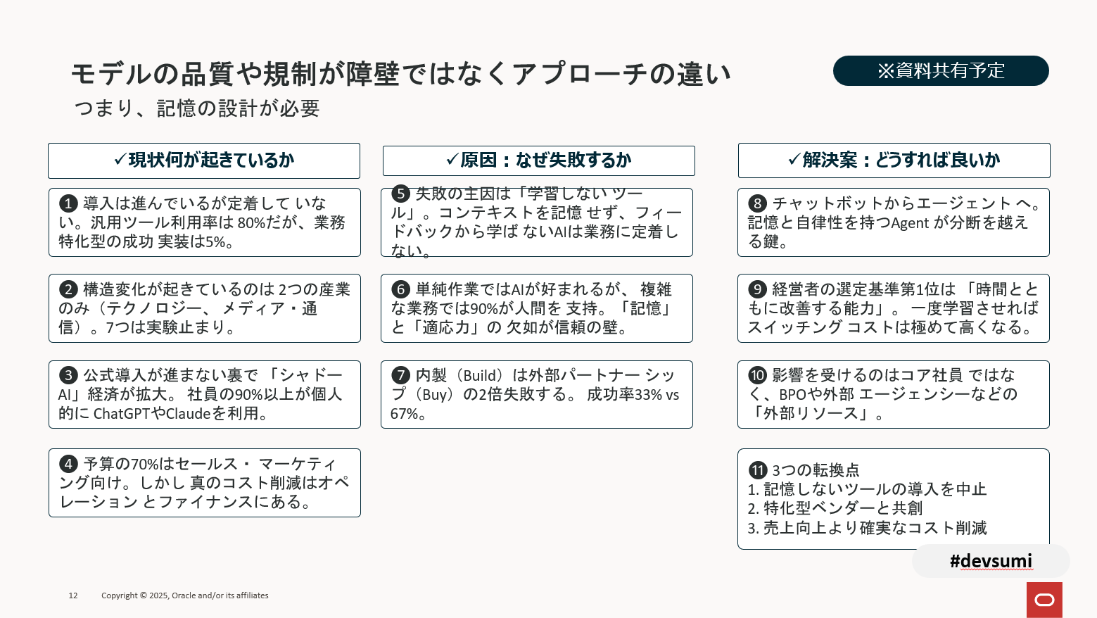特に強調されるのが、第1の「記憶しないツールの導入を中止すること」だ。ここでは、「モデルの品質や規制が生成障壁となってAIプロジェクトが失敗するのではなく、“記憶の設計”に関する問題である」ことが明らかになったのだ。