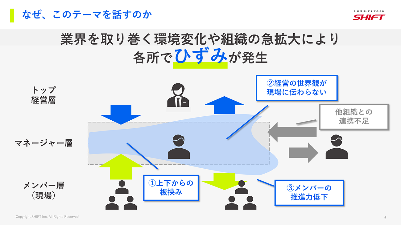 急速な組織拡大と業界の環境変化が重なると、組織の至る所には「ひずみ」が発生する。経営層からの圧力、現場に伝わらない経営のビジョン、他組織との連携不足、そして板挟みになるマネージャー層など、これらは多くの急成長企業が抱える共通の課題と言える。