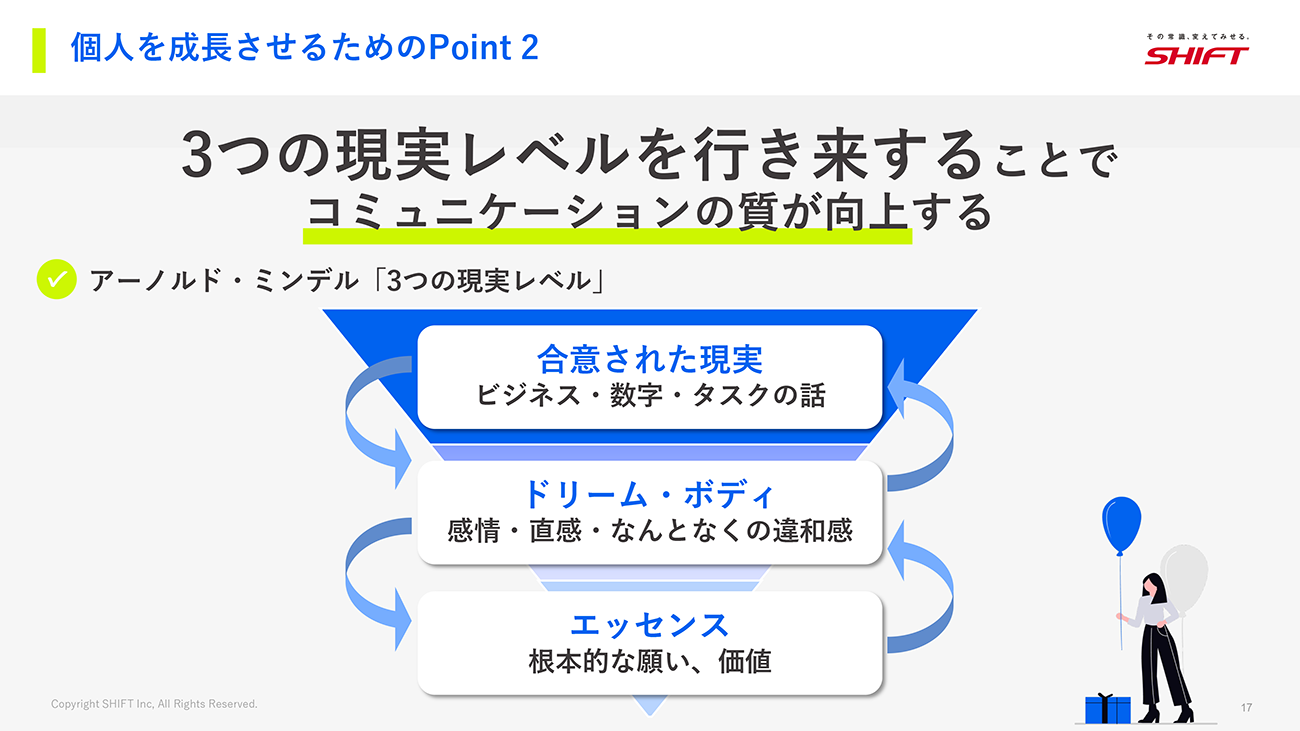 さらに、伊藤氏はコミュニケーションの質を向上させる技法として、アーノルド・ミンデルの「3つの現実レベル」を挙げた。これは「合意された現実(ビジネスやタスク)」「ドリーム・ボディ(感情や直感)」「エッセンス(根本的な価値)」の3層を行き来する対話手法である。単なる業務連絡に終始せず、相手の想いや価値観に触れることで、深い納得感と共感を生み出すのだ。
