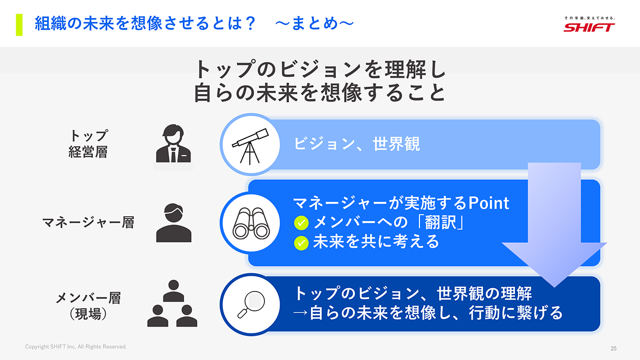 第2のポイントは、マネージャーがいかにして組織の共通の方向性を指し示すかである。SHIFTが実践しているのは「組織の未来を想像させる」マネジメントだ。組織が巨大化するほどトップが掲げる抽象的なビジョンと、現場のエンジニアが取り組むタスクは乖離しやすくなる。このギャップを埋めるため、マネージャーは「翻訳者」としての役割を担わなければならない。