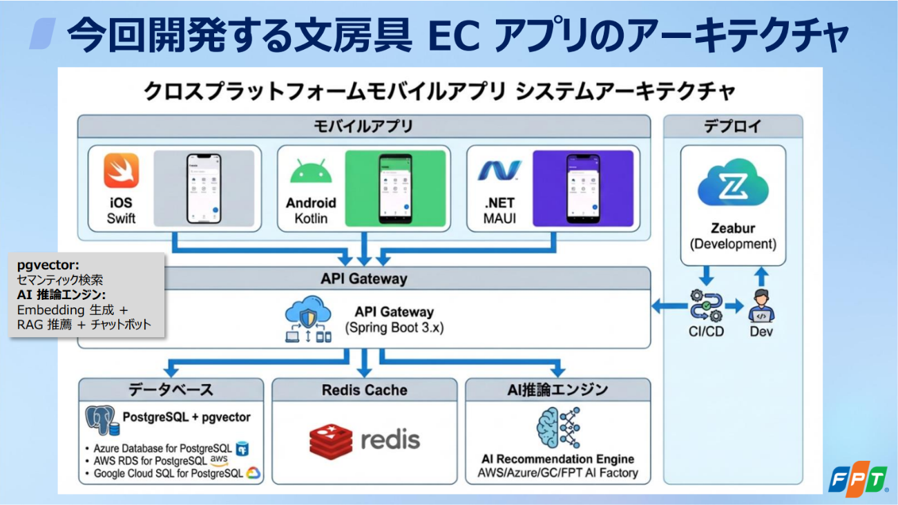 サンプルとして開発するのは文房具のECアプリ。商品データをデータベースに1000アイテムほど保有し、アプリにはセマンティック検索やAIによる商品推薦などの機能を実装する。技術スタックはバックエンドにSpring Boot 3.xとJava 17(Zeaburとの互換性により)、モバイルはSwift(iOS)およびKotlin(Android)、データベースはAzure PostgreSQLとpgvectorを用いる。ここまでは典型的だが、デプロイ部分はクラウドPaaSのZeabur、AI推論エンジンはOpenAIとFPT AI Factoryを併用する。