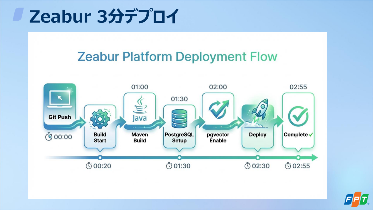 Copilotはエージェントモードでもコードの提案までという慎重なタイプなので、問題なければファイル生成を指示する。インフラの構築やDB設計などを進めて、実装が終わったら、リポジトリをコミットし、Zeaburから当該リポジトリを登録する。Zeaburは使われている技術スタックを全て自動で認識する。これで次回から簡易CI/CDのようにコミットするたび、Zeaburが自動的にデプロイを開始する。