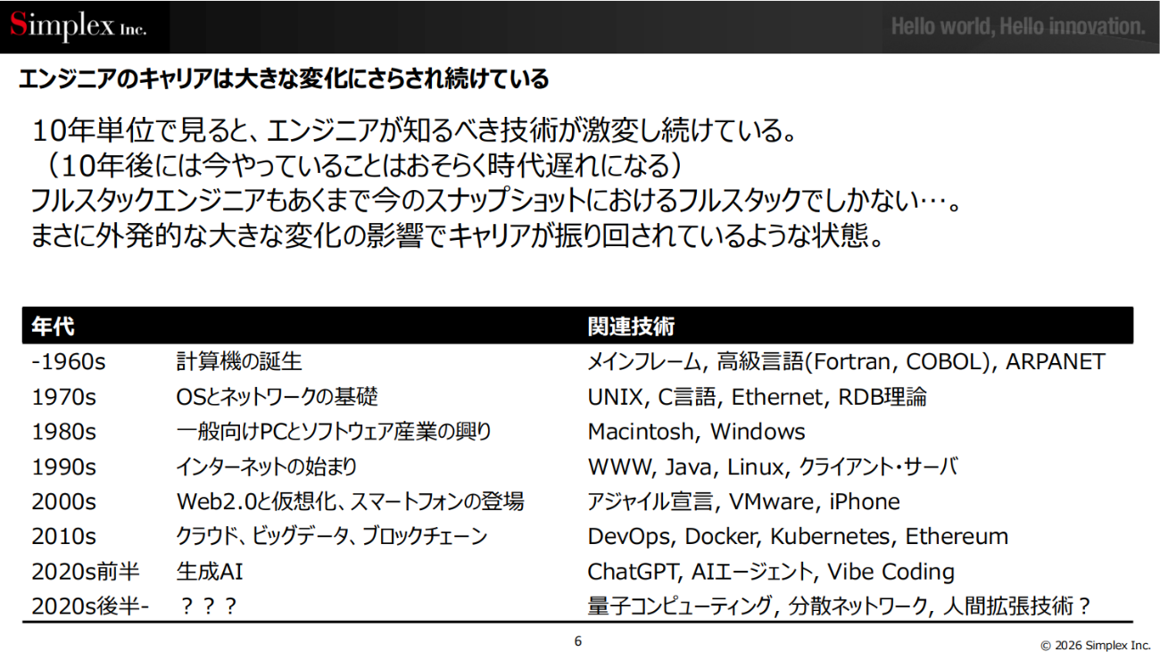 「エンジニアが知るべき技術は10年単位で激変し続けています。今フルスタックエンジニアとして幅広い技術に精通していても、10年後にはまったく異なる知識が求められるかもしれません。こうした変化に、エンジニアはどうしても振り回されてしまいがちです」(松本氏)