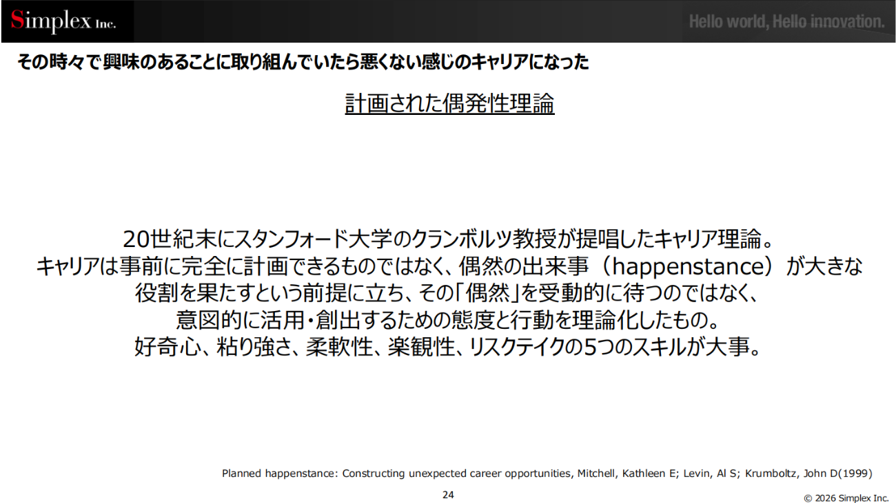 そして、意図せずして「計画された偶発性理論」を実践してきたのではないかとも感じているという。この理論は、「キャリアは事前に完全に計画できるものではなく、偶然の出来事が大きな役割を果たす」という考え方だ。「一貫性のあるキャリアを綿密にデザインする道だけでなく、予測困難な未来を前に、変化への適応力そのものを磨く道もあること、これが本セッションで伝えたいこと」だと、松本氏は述べる。