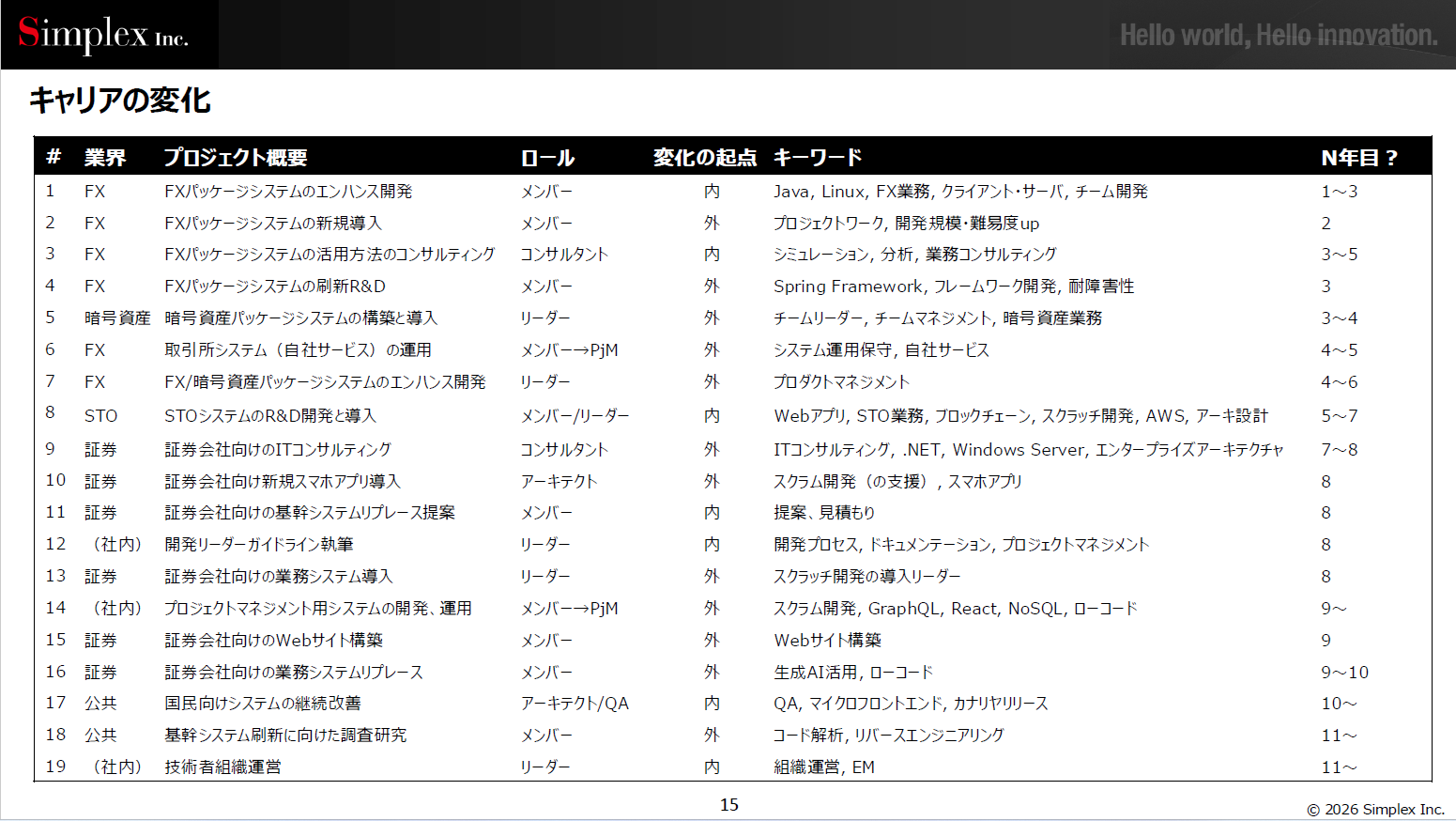 松本氏が、新卒でシンプレクスにエンジニアとして入社してから11年、現在のロールに辿り着くまで、さまざまなキャリアの変遷を辿ってきた。同時に、その過程では技術的にもあらゆる変化が生じてきた。