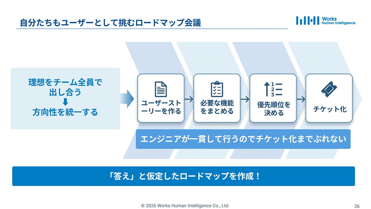 ロードマップの作成は、開発チーム全員が理想を出し合い、方向性を統一するところからスタートする。ユーザーストーリーの作成から、必要機能の定義、優先順位の決定、タスクのチケット化に至るまで、すべての工程をエンジニアが一貫して担う。これにより、開発の方向性がぶれない体制を整えた。