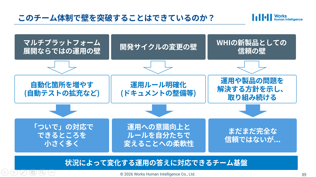 結果として、継続的な開発を阻む3つの壁を乗り越えつつある。「信頼性に関してはまだ途上」としながらも、変化に対応できる強固なチームが形成された。
