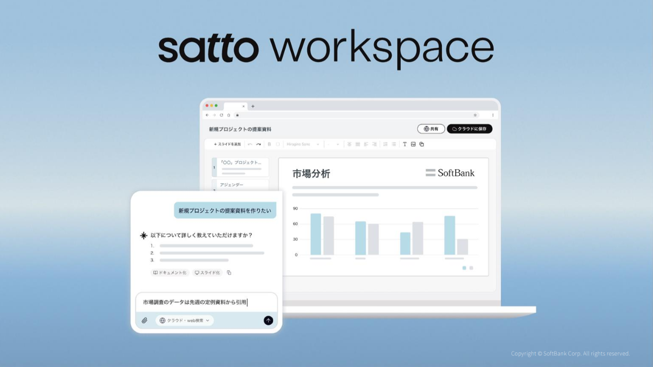 New Relicを導入したのは、新しい生成AIチャットサービス「satto workspace」の開発チームである。これは資料作成業務などに特化したサービスで、AIと人間が協調することでスライド作成といった業務を効率化できる。