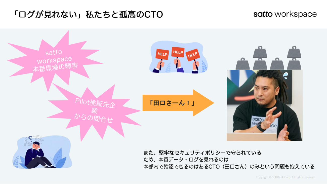 パイロット検証の段階で障害通知が届くようになったが、その都度、原因の特定と対応に追われることとなった。しかし、ソフトバンクの厳格なセキュリティポリシーにより、AWSコンソールのログを閲覧できるのは、CTOの田口氏に限られていた。