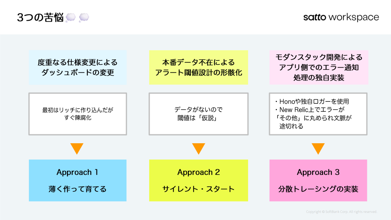 1つ目は、度重なる仕様変更によるダッシュボードの陳腐化。2つ目は、パイロット検証の段階のため本番データが不足し、アラートの閾値設定が形骸化していたこと。3つ目が、モダンな技術スタックを使用しているためにNew Relicとの連携に独自の処理が求められることである。