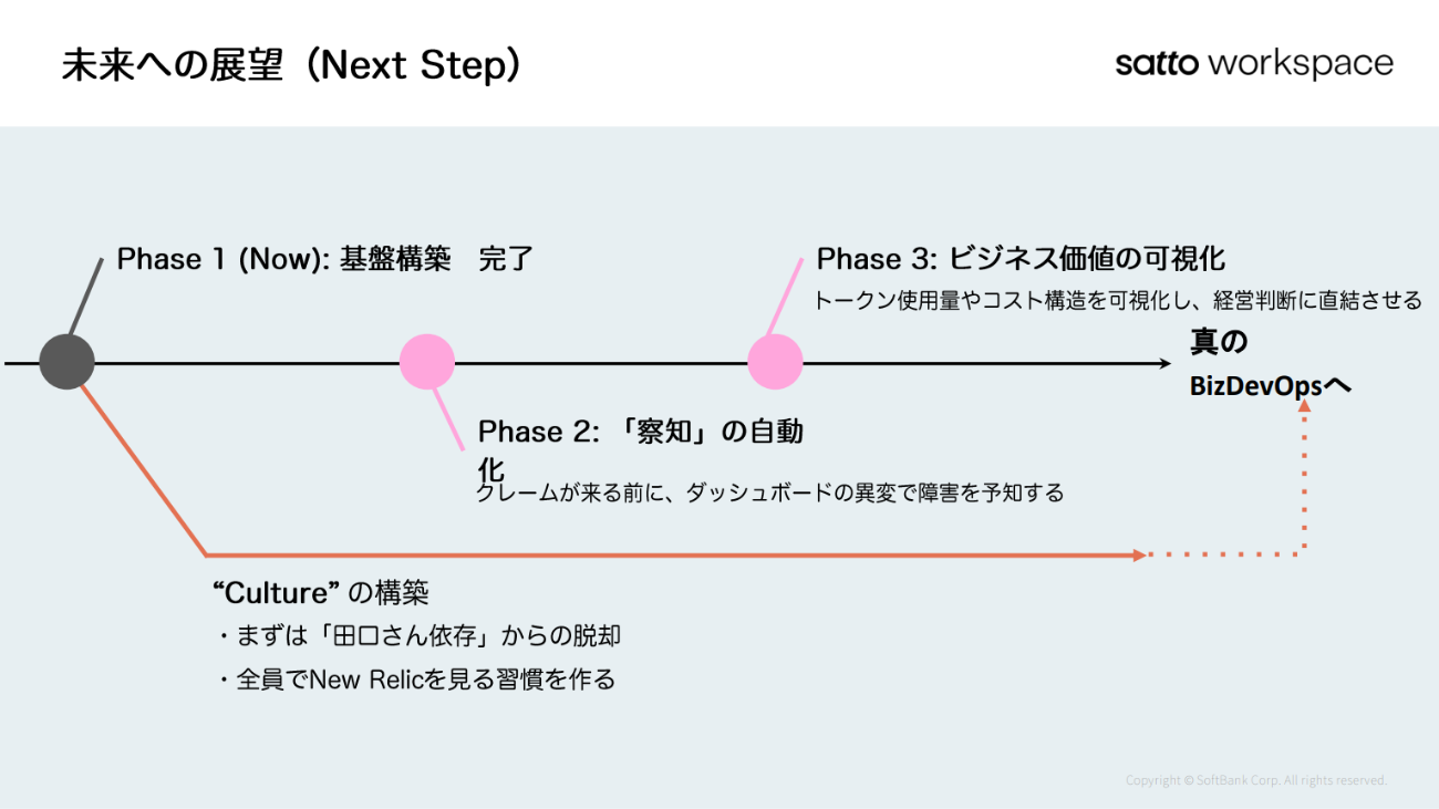 今後の展望として、ダッシュボードの異変から障害を予知する「察知」の自動化を目指している。さらに、トークン使用料などのコストを可視化し、経営判断に直結させるステップも見据えているという。