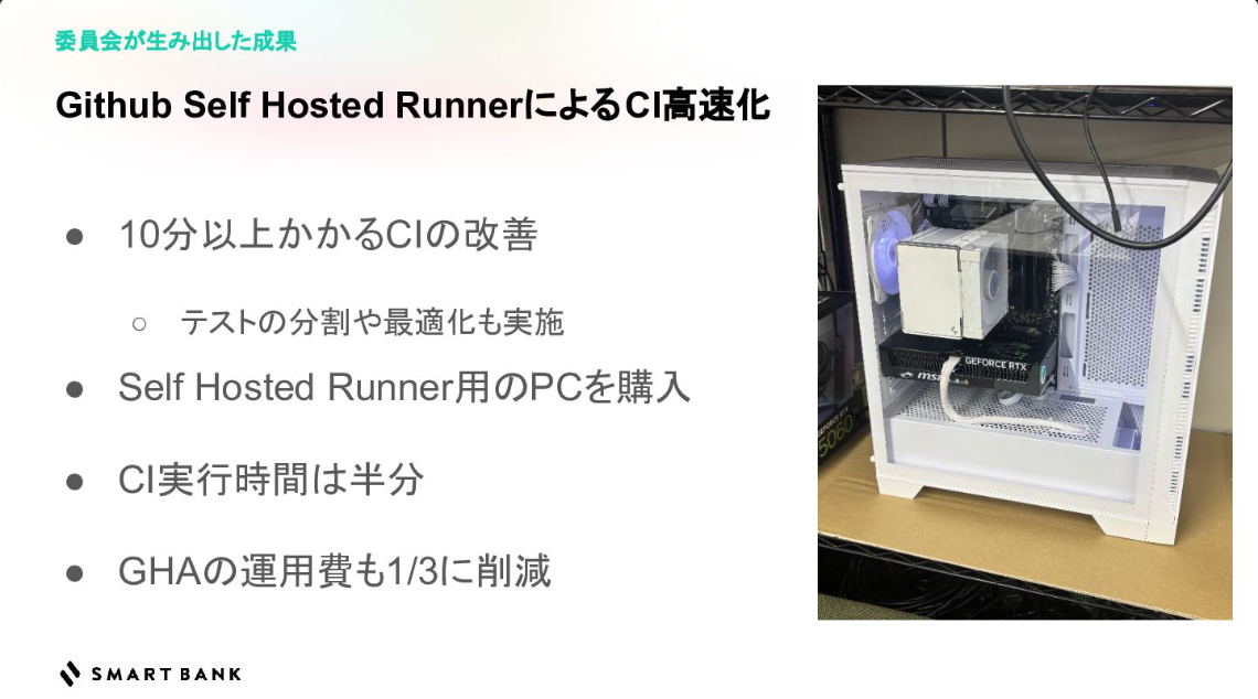 さらに、自社ホスト型ランナーの導入によりCIの実行時間は半減し、月額20数万円かかっていた運用コストを約8万円にまで圧縮するという劇的な成果を上げた。