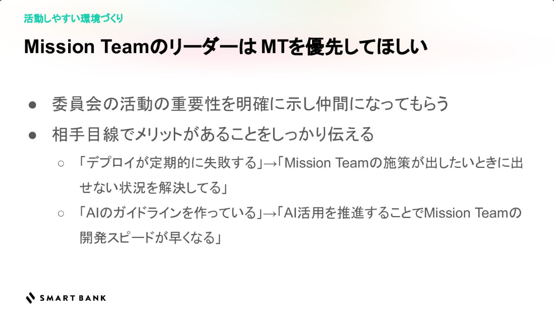 しかし、これらの成果は決して平坦な道のりの上に成り立っていたわけではない。導入初期には、ミッションチーム(主務)と委員会(兼務)のタスクバランスという組織的なジレンマに直面した。経営陣が売上向上を強く求める中、ミッションチームのリーダーからすれば、メンバーが委員会の活動に時間を割くことは歓迎しづらい。三谷氏はこの壁を突破するため、全社会議などを活用した泥臭いアピールに奔走した。デプロイの安定化やAIの活用推進といった委員会の成果が、最終的にはミッションチーム自身の機能開発スピードの向上やスケジュール遅延の防止に直結するという「相手にとってのメリット」を粘り強く説き続けた。