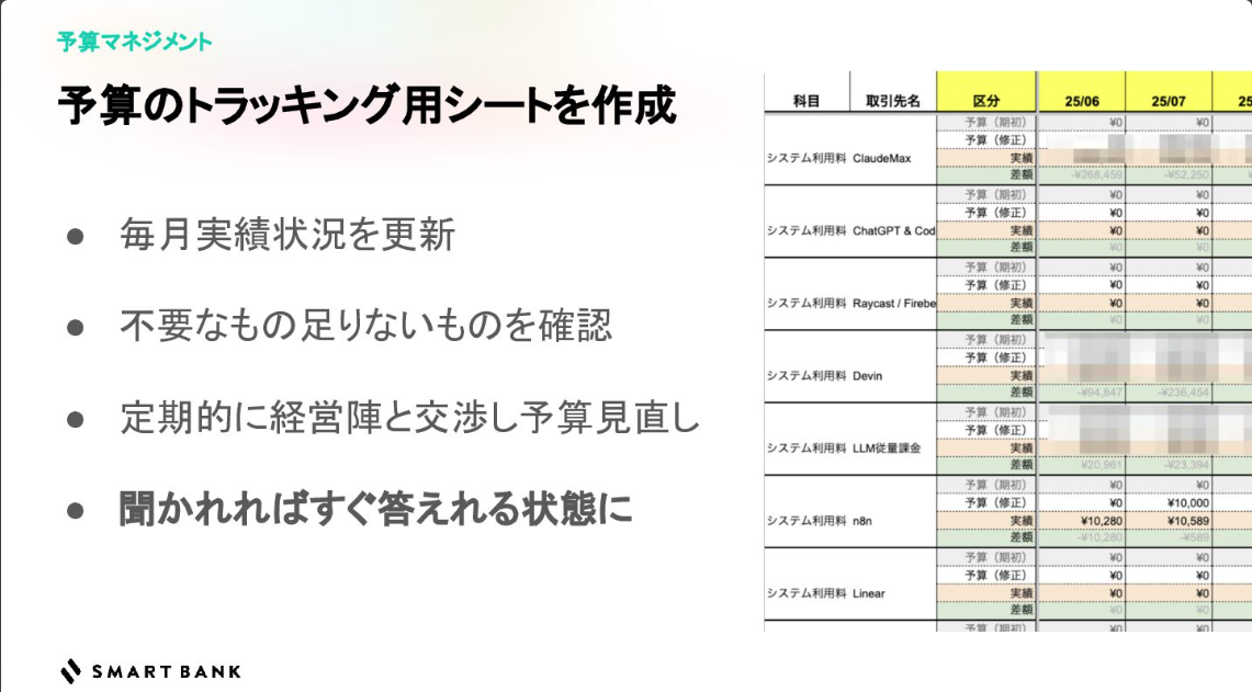 また、現場のエンジニアが新しい技術的挑戦に踏み出す際の心理的ハードルとして「予算」の問題があった。物理PC購入や高額なAIツールの利用など、コストを理由に提案を躊躇するメンバーは少なくない。この課題に対し三谷氏は、EM自身が部門の予実管理を徹底するというアプローチをとった。常に予算の消化状況を把握し、メンバーから経費の相談を受けた際にはその場で「絶対大丈夫だからいけるよ」と即答できる体制を整えた。予算に対する権限と責任をマネージャーが引き受け、メンバーには投資に対する安心感を与えることで、お金を理由にした引っ込み思案を排除したのだ。