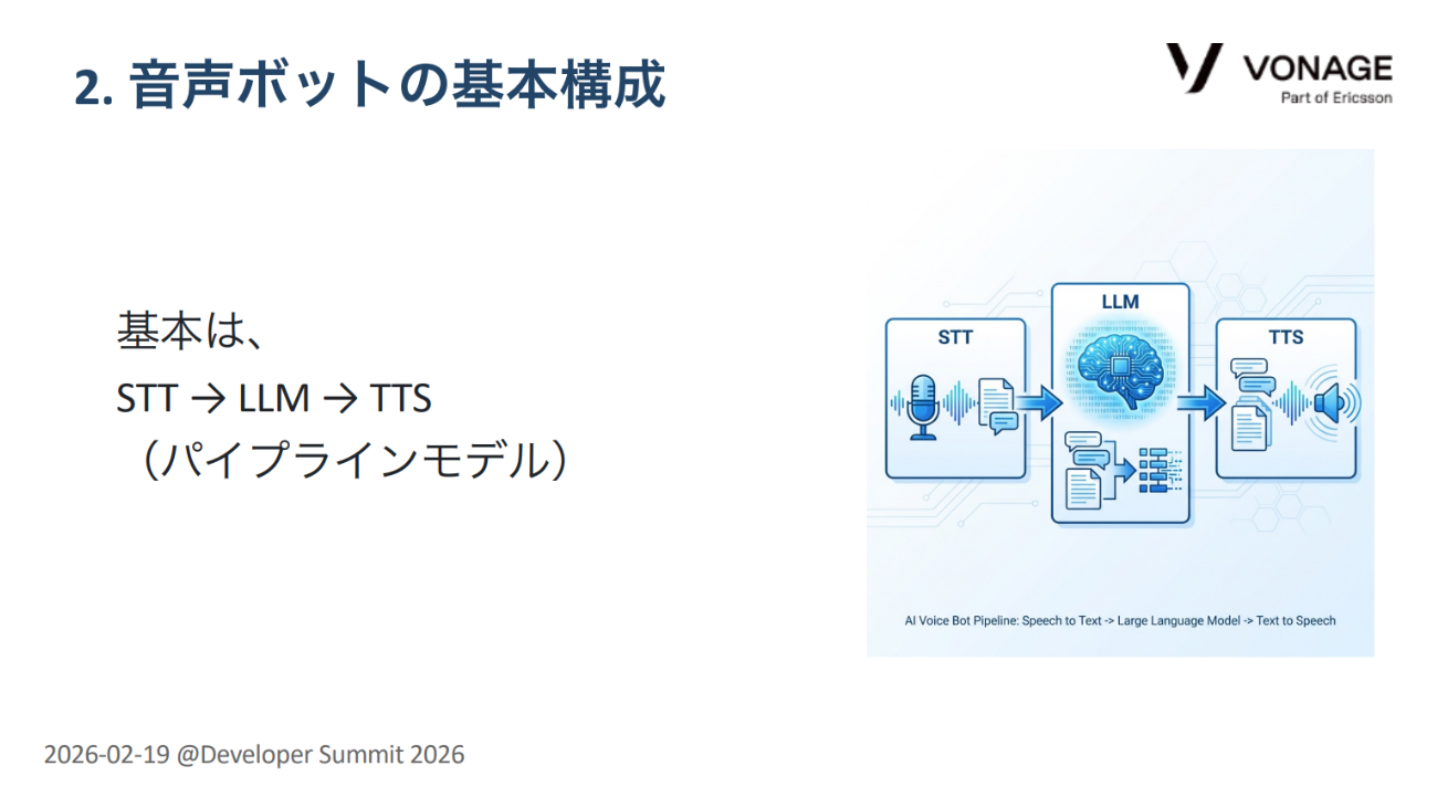 音声ボットの基本構成は、Speech to Text(STT:音声認識)、LLM(大規模言語モデル)、Text to Speech(TTS:音声合成)の3つを直列につないだパイプライン型だ。各コンポーネントを個別に差し替えられる「部分最適化」が利点だが、テキストを経由するためタイムラグが生じるのが弱点だ。