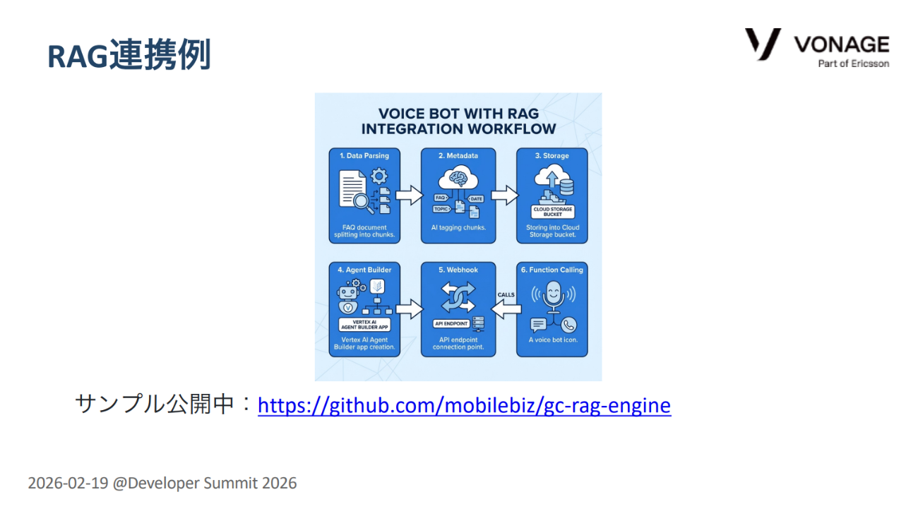 留守番電話サービスTRANSRECの場合、FAQとの連携にGoogle CloudのVertex AI Agent Builderを活用している。Function Calling経由で音声ボットから呼び出す構成で、サンプルコードはGitHubで公開されている。
