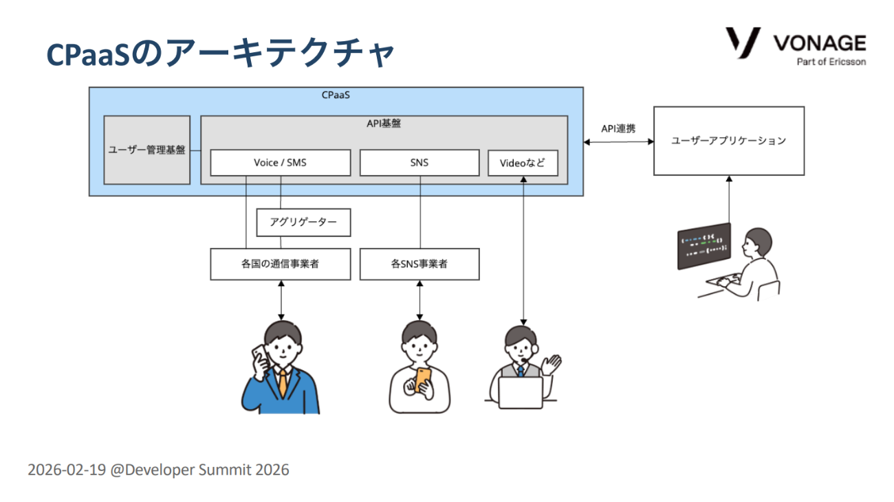 音声ボットをブラウザ上だけでなく実際の「電話」として使うには、もう一つのピースが必要だ。それがCPaaS(Communications Platform as a Service、シーパスまたはシーパース)だ。電話・SMS・Videoなどのコミュニケーション機能をAPIとして提供するクラウド基盤で、代表的なサービスにVonageとTwilioがある。なお、KDDIウェブコミュニケーションズはVonageの国内販売代理店でもある。
