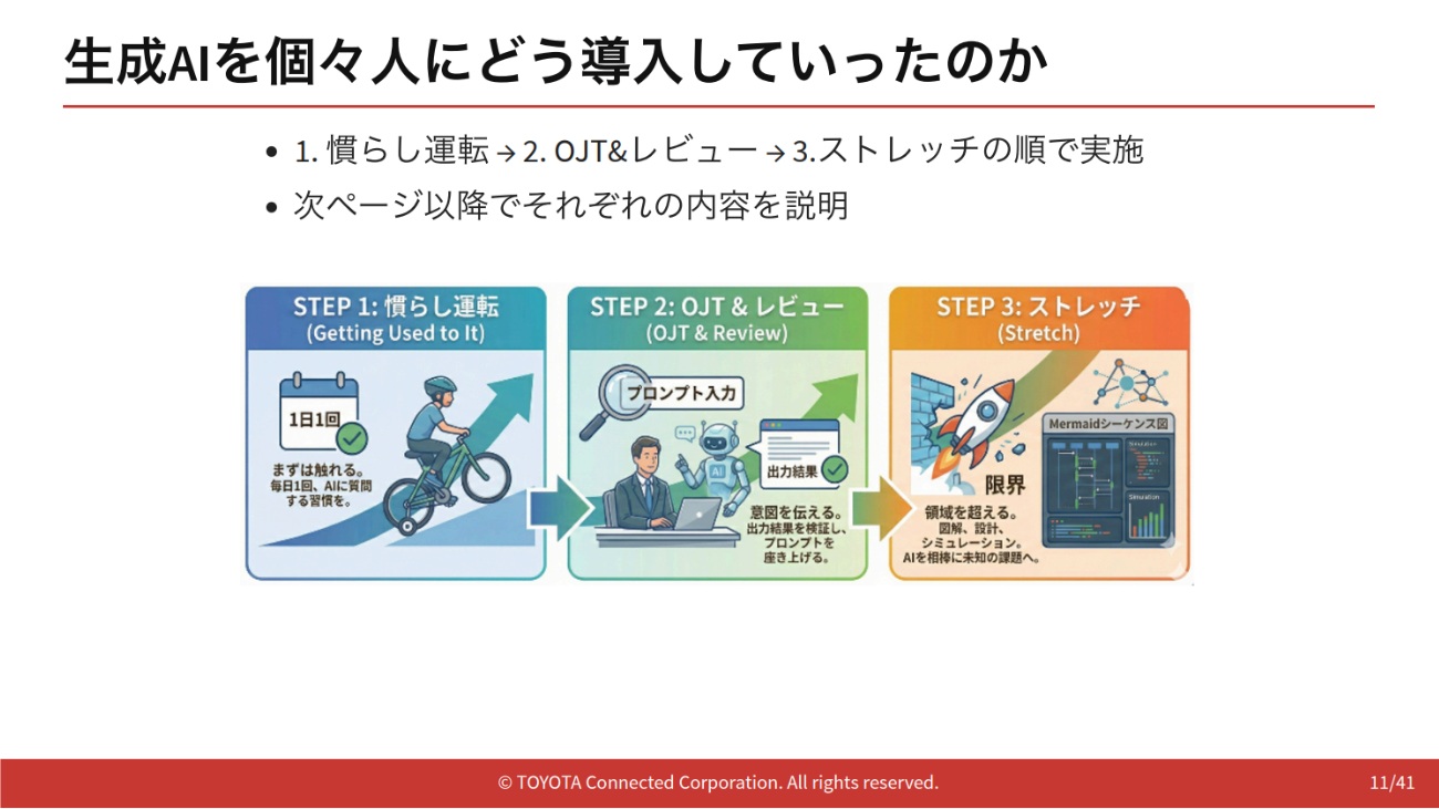檀野氏が自身のチームに生成AIを導入した手順は、次の3ステップだったという。