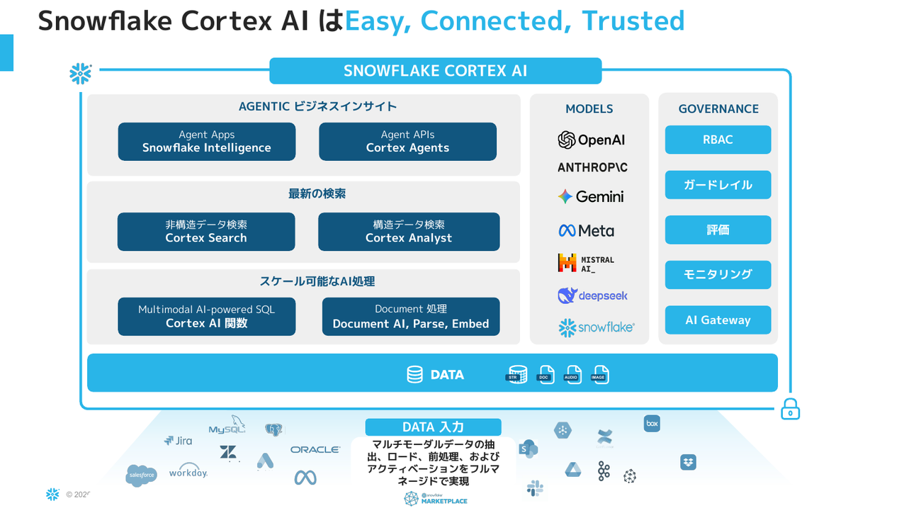 なお、Snowflake にはセマンティックモデルとは別に「セマンティックビュー」という仕組みも存在する。CREATE SEMANTIC VIEWで作成するスキーマオブジェクトで、YAMLファイルを手動管理する代わりにSQLやSnowflakeのGUI画面から直接管理・共有でき、SQLで問い合わせ可能なビューとして機能する。Cortex Analystから利用可能だ。